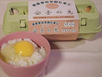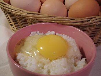 卵をカゴに入れて、卵かけご飯と一緒に。撮影後にいただきました。