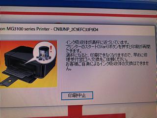 インクの吸収体が満杯やから、はよ修理に出せと。しかも、自分ではできひんで~とまで