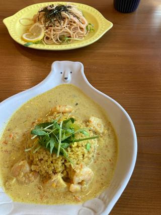 ランチを!お料理の器に至るまで可愛いクリームカレーとたらこのパスタを