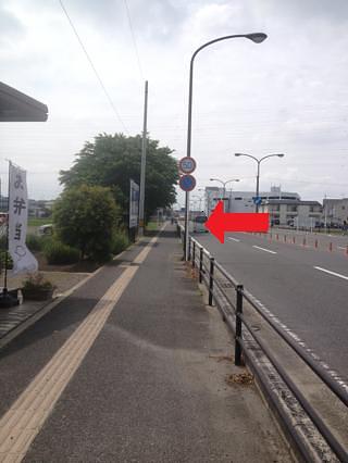 店舗正面左の道をまっすぐ行き、倉庫の裏に入るように赤矢印の方向に右折。