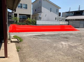 赤で色を塗っている部分は当店の土地ではありませんので、出入りの際つい大回りをしてしまったり、バックで駐車される際など侵入してしまいがちになりますが、駐車はもちろん、入らないようにお願いします。