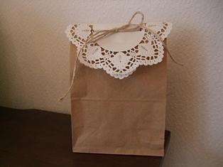 これ、紙袋に、レースペーパーをかけてパンチで穴をあけて、麻紐を通して結ぶ。