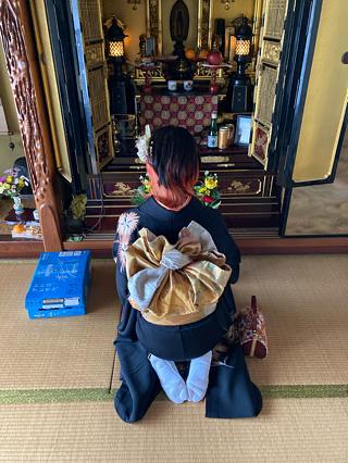 お仏壇でおじいちゃんにも報告です。成人式見たいって言ってたもんね。