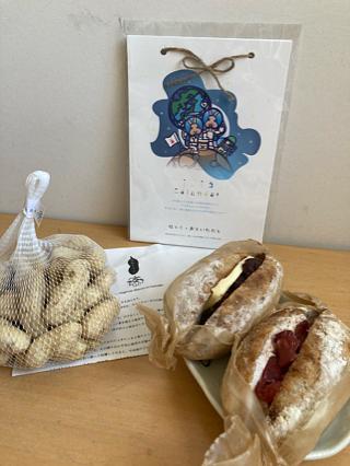 いろいろいただきましたよ~奥居さんの2023のカレンダー、杜のはたけさんの落花生、つむぎさんのぱん。エコバックの中が落花生のいい香りがしてました。茹でて食べようと思います~