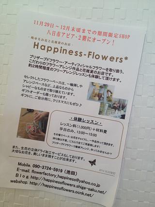 滋賀咲くブログでお知り合いになった、「Happiness-Flowewrs*」のハピネス*さんが11月29日~12月末頃まで期間限定でアピアの2階でフラワーアレンジ作品のSHOPを出されています。