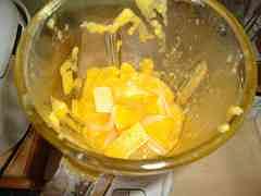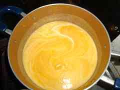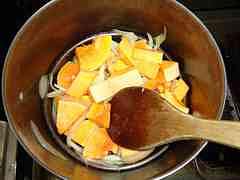 鍋にバターを入れて、タマネギを軽く炒めます。カボチャをくわえて、さらに炒めます。焦がさないようにしてください。