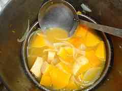 水とコンソメスープの素を入れて、カボチャがやわらかくなるまで煮ます。