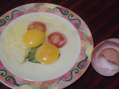 中から出てきた卵も割ってみました。普通の卵ですが、卵白が少し濁っていました。目玉焼きにしていただきました。