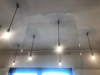 カウンターの前に飛沫防止シートを張っているのですが、最近、商品の受け渡しの隙間が狭くなったような・・・と上を見上げると、天井に貼っている透明テープが重みではがれてきて接着面が1cmほどになっている