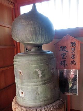 日本一古い日本のワイン、陶器の硬貨、赤穂浪士討ち入りの第一報の手紙、二宮金次郎直筆の領収書、正倉院にもある石薬、日本最初の企業年等興味深いものばかりでした。特に、草津の常夜燈、瀬田の唐橋の作り直しに寄進する等慈善事業にも大いに力を入れたことが分かりました。 写真は瀬田の唐橋の擬宝珠。