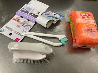 シンク洗い用ブラシと、スライサーの金具洗い用ブラシと、食器洗いスポンジ。