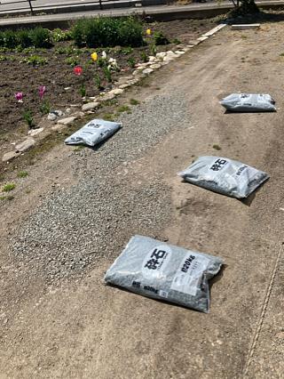この前、駐車場の砂利を足したのですが、畑側の凹みも気になっていたので、追加してきました。