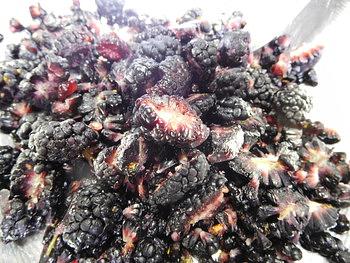 冷凍した桑の実を半分に割って、ヘタを取り除きました。