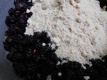 鍋に桑の実を入れ、桑の実の重さの半分の重さの砂糖を入れます。今回はキビ砂糖を使いました。