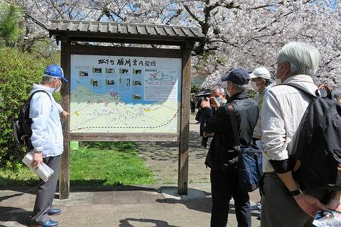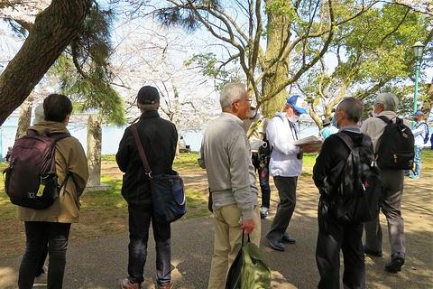 その後、膳所城南大手門跡の説明を受け、桜が見頃の膳所城跡公園へ。 膳所城の説明を受ける参加者。