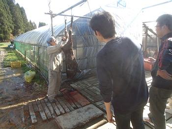 途中で猟師さんが鹿を持ってきてくれました。早く処理した方がいいので、目隠しして鹿の処理をしましたが、見てみたい!と最後まで見守ってくれた方もおられました。いい体験しました~との感想。鹿肉入りおでんも食べていってくれました。