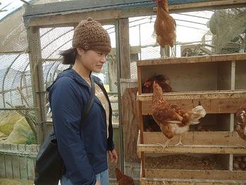 初めての鶏小屋にちょっと緊張~。卵が目の前にあるのですが・・・