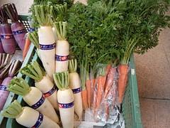 サラダなど生食用の紅芯大根、青長大根。おろしにすると紫色がきれいな赤大根は、煮物にも向きます。