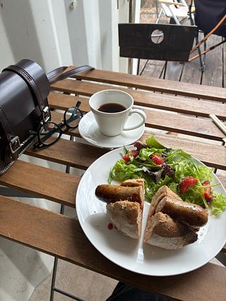 石窯パンはつむぎさんのパンに自家製ソーセージが挟んであります。お肉の味がぎゅっと閉じ込めてあり、すっごく美味しかったです