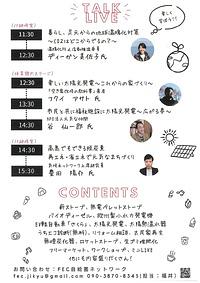 薪ストーブ、無電ペレットストーブ、バイオディーゼル、欧州製小推力発電機、EV軽自動車「さくら」、太陽光発電、太陽熱温水器、うちエコ診断(無料)、リフォーム相談、古民家再生、無煙炭化器、ロケットストーブ、生ごみ堆肥化、フリーマーケット、ワークショップ、ミニLIVE、他にももりだくさん。