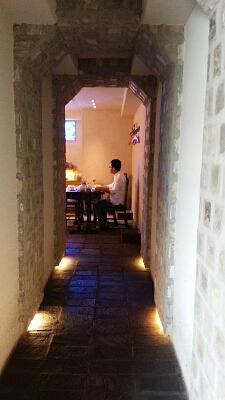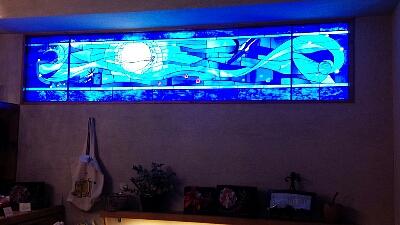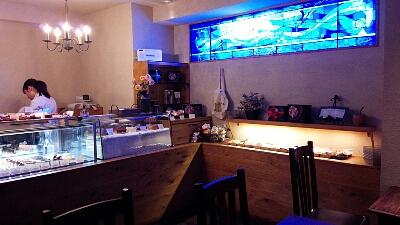 お店の中は洞窟のなかみたいに照明を暗くしていて、ブルーのステンドグラスがお店の雰囲気をさらに引き出しています。