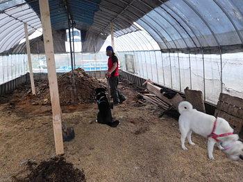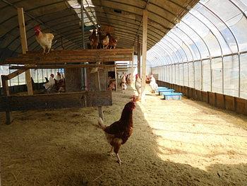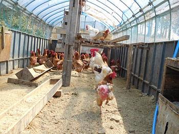 今年の冬の雪で屋根のビニールが重みで危険になり、ブルーシートをかけているので、鶏舎の中も青の世界・・・。
