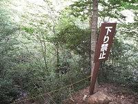 遊歩道を進んでいくと、右手側の魚止の淵・障子ケ淵への下山は、下り禁止の道標と虎ロープが張ってあった。ところで、先月8月15日、障子ケ淵から長い鎖を伝ってよじ登り、この場所に辿り着いたことが、思い出された。