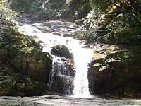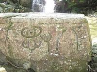 大摺鉢ノ淵には直ぐに着いた。この滝は、沢を渡って正面から眺めると、大きなすり鉢に水が流れ込んでいるよう形になっていた。この名前がついた由縁だろう。また、前回見つけられなかった大摺鉢ノ淵のシンボル「八徳」が彫られた大岩もあった。写真の文字は、