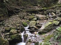沢沿いの登山路をしばらく進んだ。細くなった沢を渡り、左手の山腹に付けられた登りが続いた。 突然、なかなか見応えのあるアシウ杉の大木に出会い驚いた。神秘的で精霊が住んでいそうな雰囲気であった。平坦な道に変わり、広谷へと向かった。このあたりは、訪れる人も少なく静寂であった。時折、谷間から吹いてくる風が快い。静寂の中に、沢の水音が、より心良い。