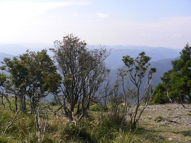 ここより、ブナ林に覆われた沢沿いの道を登っていった。深く掘れた溝状になった登山路を進むと、除々に樹木が少なくなり、木の間から、僅かに頂きが目えるようになってきた。コヤマノ岳と武奈が岳の鞍部に出て、笹に覆われた尾根道を登り切ると、そこは、武奈ヶ岳の頂上であった。