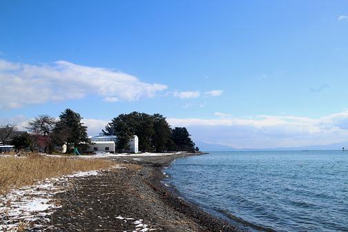 近江今津から菅浦辺りの雪を被った山々は見られたが、対岸の長浜まで遠く見通せなかった。琵琶湖の最大の幅は、長浜市下阪浜町と 高島市新旭町饗庭との間22.80kmもある。琵琶湖は、昔、余にも大きい湖なので、「淡海の海」「鳰(にほ)の海」と呼ばれていた。ここに立てば、誰もが「海」と言う言葉を使うだろう。また、琵琶湖は別名「さざなみ」とも呼ばれていた。まさに打ち寄せる波の音を聴いていると、そう言いたくなる。