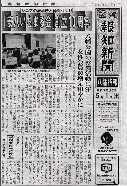 2021年05月03日 安八10周年滋賀報知記事 【安八いちまる情報】 • 近江八幡市 詳細 事務局 お気に入りに追加 安八いちまる会会員各位4月15日の安八10周年記念大会の取材記事本日の(5月1日(土)付け)「滋賀報知新聞」に掲載されました。各戸配布だと思いますのでご覧ください。念のためコピーを添付します。2021/05/01 (土)会長k..k この記事を報告する 不適切な内容や規約違反を発見した場合はご報告ください