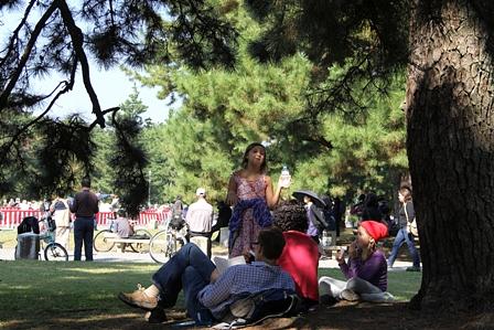 京都御所の正門である建礼門前から南に延びる大通りは、大勢の人が詰め掛けていたので、芝生地と松の木陰で待つことにした。外国人の家族も繰り出していた。