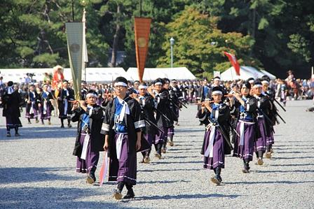 明治維新から延暦時代へさかのぼって、順次風俗、文物の変遷を再現。現在は18列、2000人に達し行列の長さは2キロに及ぶ壮大な行列になりました。