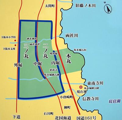 坂本城址公園にある坂本城の縄張り図。 これを見ると大体のスケール、位置関係が把握できます。