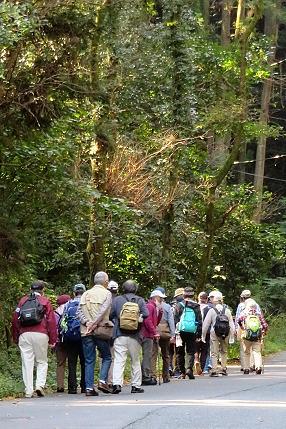 長等公園にて小休止し、等正寺を過ぎ、峠越。 急な坂道を進むメンバー