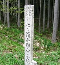 上丹生から少し行ったところに駐車場があった。気心が知れた山仲間4人で出発していった。 登山口には『七七頭岳観音参道』と刻まれた石柱があった。この山の山頂には伊香西国三十三観音第29番札所があるので、お参りの方のための道標が建てられていた。
