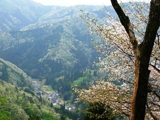 山桜が道際に咲いていた。七七頭ガ山から摺墨川に向かって落ち込んでいる西斜面のあっちこっちに、山桜が見られた。木々は芽吹いて山全体が青味色をおびているが、ところどころに、薄赤く染まっている個所がみられたので、そう思った。これから桜が咲く時期に入ったようだ。また、赤いコバノミツバツツジの花も咲き始めていた。
