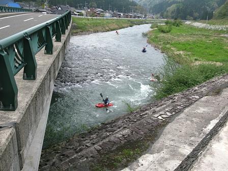 この界隈、色んな遊び方をしている人達に出合った。高時川の急流に数隻のカヌーが、我々追い抜いていった。急カーブに差し掛かると、先頭カヌーは全員が無事通過するまで留まる様なこぎ方をして、後続艇を待ち、一団となると隊列を組んで過ぎ去って行った。