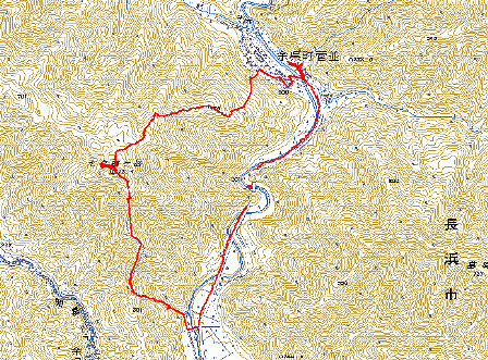 高時川沿いの植林内の平坦なところを進み、山頂から南に張り出している尾根筋に向かってジグザグの急な登りになった。「←七七頭ヶ岳」という標識をみやって、進んでいった。山道は深くえぐれた溝状に掘れ込んでいた。信仰の山でもあり、よく踏み込まれたのであろう。標高380m辺りまでやってくると、稜線に出た。左側に展望が開き、眼下に余呉町の高時川の支流摺墨川に沿って拓けた集落が見えた、少し休止。
