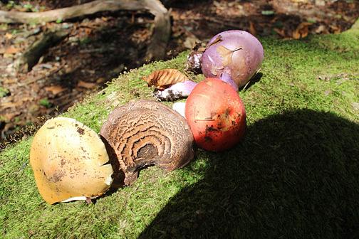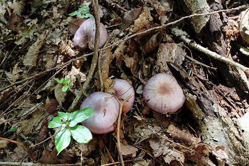 仲間H氏は、次から次と採取していった。頂上手前で、「ムラサキシメジ」が群生。手当たり次第に袋に詰め込んでいた。気味悪い紫色だが、美味しいらしい。後日、色々食べたが大丈夫だったとのメールを寄こしてきた。