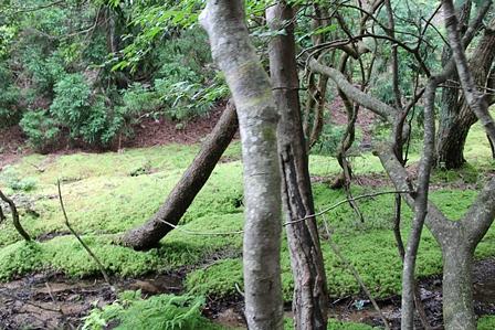 寒風峠から下ってくると、黄緑色の苔が生したこぢんまりとした湿地が広がっていた。不思議な場所だなーと思い表示も、柵も無かったが、出来るだけ入らないように脇を歩き通過していた。誰かがシンガ谷源流の「オトシ」と呼ばれていると説明してくれた。