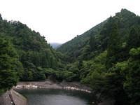 最後の急下降を下り、テープ目印を見失ったが、左の尾根に回りこんでいくと、目印のテープが見つかった。下山してくると幾分霧が晴れてきて、この辺りから下にスカイラインの舗装路が見えてきた。岩壁を通り抜け、深山橋の左岸から延びる林道の付け根に出て、目的地点深山橋に難無く到着した。