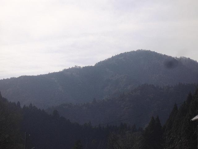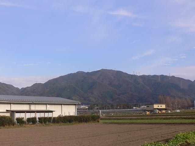 旧愛東町の東端にある山並みは、北から白鹿背山(標高:755m、はっかせやま)、明神山(標高:705m)、高野山(標高:685m)の三山である。この前衛峰のため日本コバは見えなかった。
