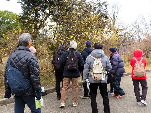 温室に向かいましたが、途中でニュートンのリンゴの木の説明を受け、この時期咲いている蠟梅が目に留まりました。