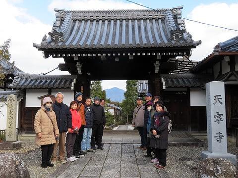 この後、植物園に別れを告げて、加茂川を渡り、天寧寺を目指しました。 天寧寺では比叡山をバックに集合写真。