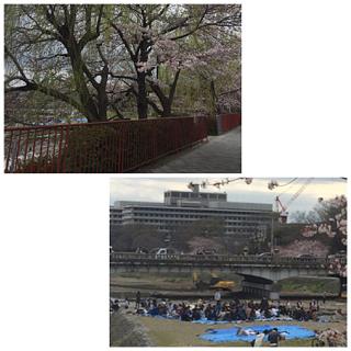すごい人がいっぱい‼︎鴨川ですっごい大きなブルーシートをひいてお花見をしているグループがいらっしゃる。