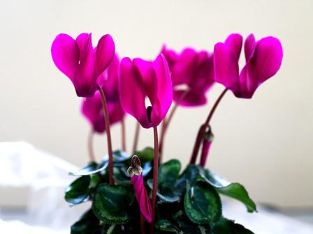 最近、冬の鉢花の女王とも呼ばれている「シクラメン」の小鉢を身近に置いてみた。