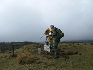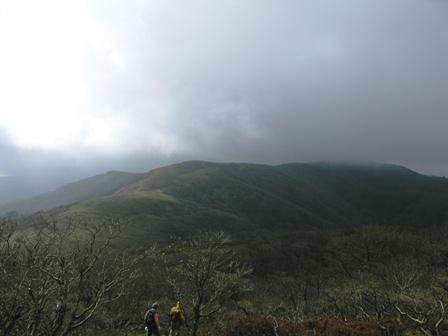 低木の潅木地帯にさしかかってくると、落葉が轟音と共に舞い上がり、下草は風に翻弄され激しく波うち、様相が一変した。「寒風」まで上り詰めると、遠くの山容が何とか見える程度に陰っていた。山稜は若狭湾と琵琶湖に挟まれおり、日本海から次から次と筋状の白い雲が、すさまじい勢いで襲いかかってきては琵琶湖へと流れ去っていった。遮るものがないので風を体で受け止めるしない。兎に角、縦走路を腰をかがめてひたすら進んだ。ドーム型の山腹をした大谷山(813.9m)の山塊が見えてきたが、山頂は雨雲で覆われていた。