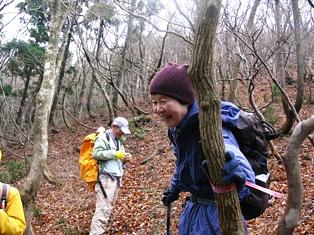 さらに高度を上げていくと道が緩やかになり、見事なブナ林となった。深く掘れこんだ山道には落ち葉が溜まり、絨緞を敷き詰められていた。ブナの木がバックの空のブルーにひときわ映えた。すがすがしいブナ林の越しの青空に僅かながら天気回復を願った。